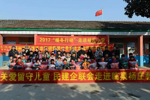 由潁州晚報組織的大型公益活動2017年“暖冬行動”首次揚帆起航。民建阜陽市委主委吳永利、民建阜陽市企業(yè)家聯(lián)誼會副會長張濤(廣宇集團董事長)、臨泉縣委副書記李向章、阜陽市碩霖園林景觀工程有限公司總經(jīng)理周夢茹、阜陽日報社社長張洪、潁州晚報總編輯李生組成慰問團前往臨泉縣呂寨鎮(zhèn)楊莊小學(xué)開啟“暖冬行動”的首站。 寒冬來臨,為55名留守兒童送去嶄新的棉衣,阜陽日報社全體員工、阜陽新華書店也熱心加入其中,為楊莊小學(xué)無償捐贈圖書,“博學(xué)圖書館”也正式掛牌。課后,幾十個孩子們蜂擁而至,紛紛前來借書、讀書。溫暖的陽光下,手捧翹首以待的圖書,臉上流露著花一般的笑容。 公益需要每一個人的行動力,為了讓冬天因我們而溫暖,讓你我一起與希望同行 。一份愛心,溫暖寒冬。