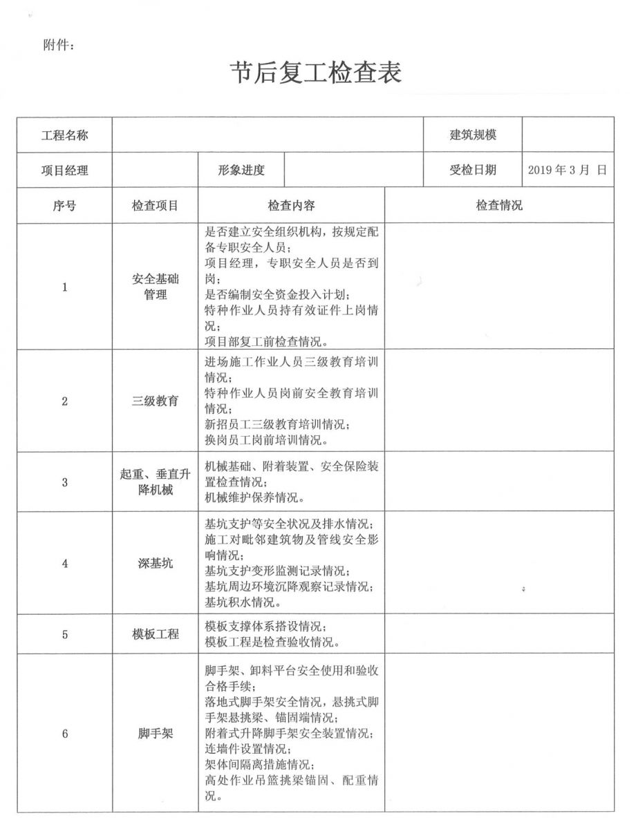 | 關(guān)于開展2019年節(jié)后復(fù)工暨春季施工安全、質(zhì)量及揚(yáng)塵防治大檢查的通知 |